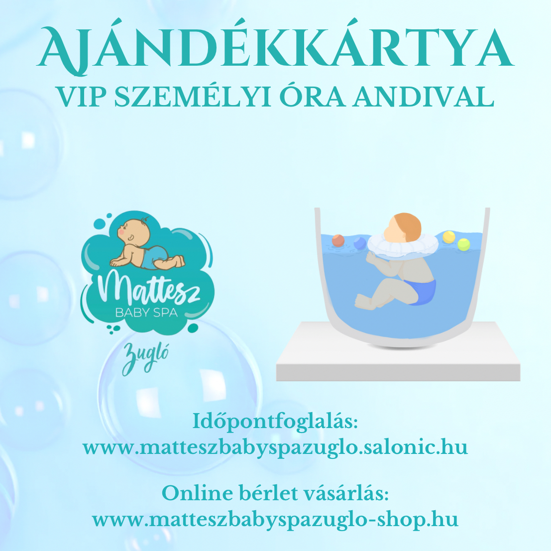 Különálló VIP szobánkban lehetőség van érzékenyebb kisbabákkal történő meghitt elvonulásra, ugyanaz történik, mint egy személyi órán, de itt csak Ti és az instruktor vagytok jelen. A VIP foglalkozások frissítő bekészítést is tartalmaz.